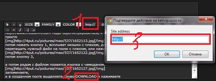 а потом рядом с файлом появится кнопка с чемоданом, запоминаете, и в созданном посте выделяете (по середине слова 2 щелчка левой клавишей мыши) слово DOWNLOAD и нажимаете в поле 3 вставляете запомненное из медифайра по идее должно заработать